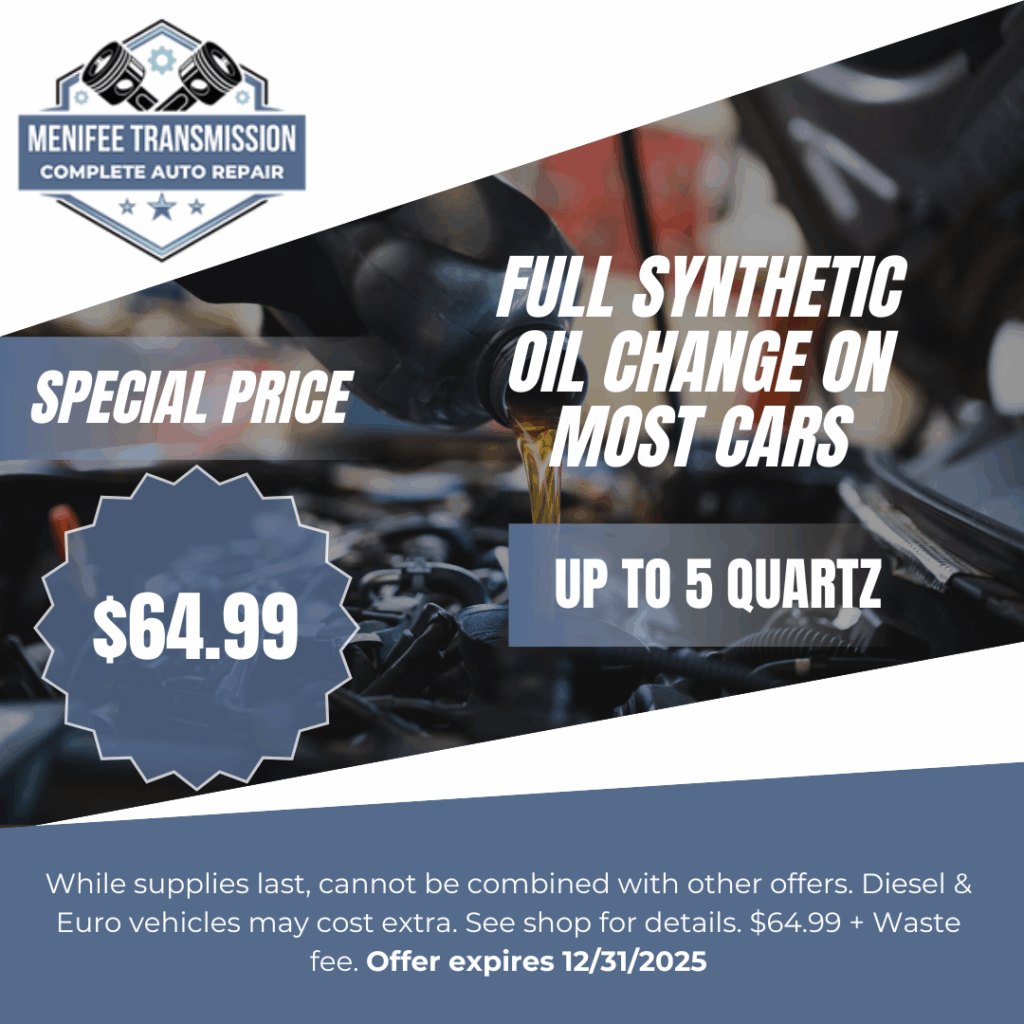 Regular car maintenance is essential to keep your vehicle running smoothly and safely on the road. At Menifee Transmission, we offer a wide range of car maintenance services, including oil changes, brake checks, tire rotations, and more. Our team of experts will help you keep your car in top condition