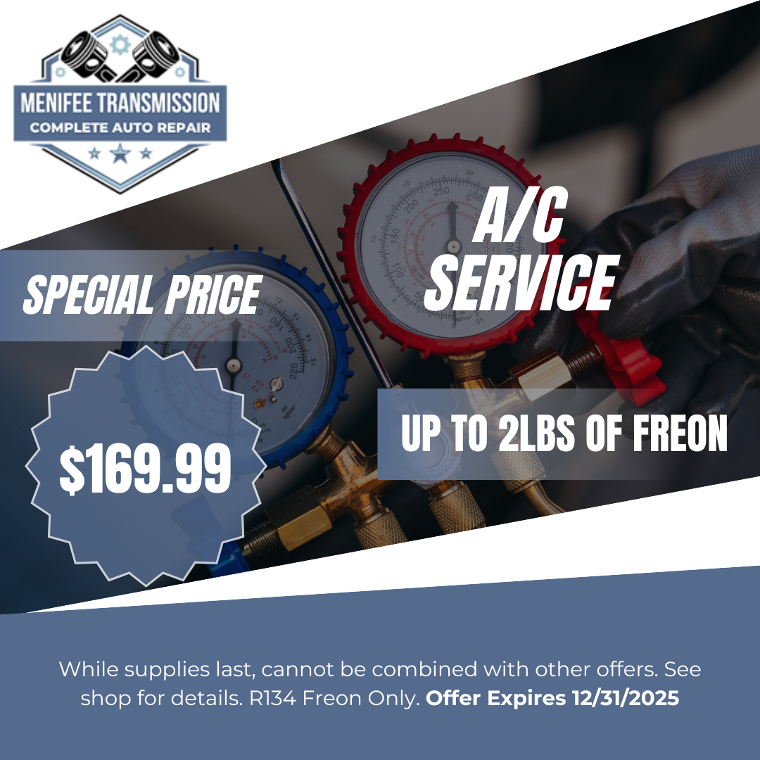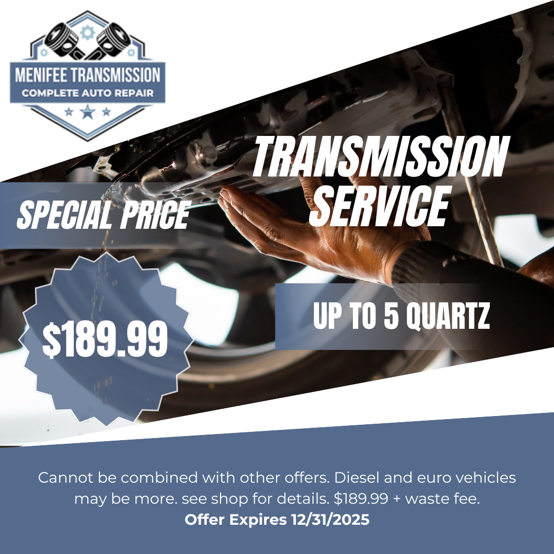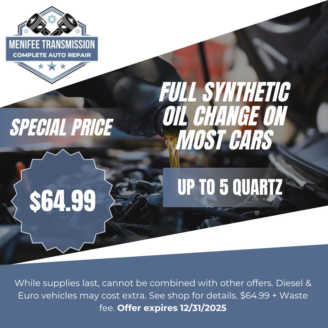 Get a full synthetic oil change on most cars for only $64.99. This price is valid up to 5 quartz. Cannot be combined with other offers. Diesel & Euro Vehicles may cost extra. Only valid at Menifee Transmission & Auto Repair. $64.99 + waste fee. Offer expires 12/31/2025 . Must present coupon to staff.